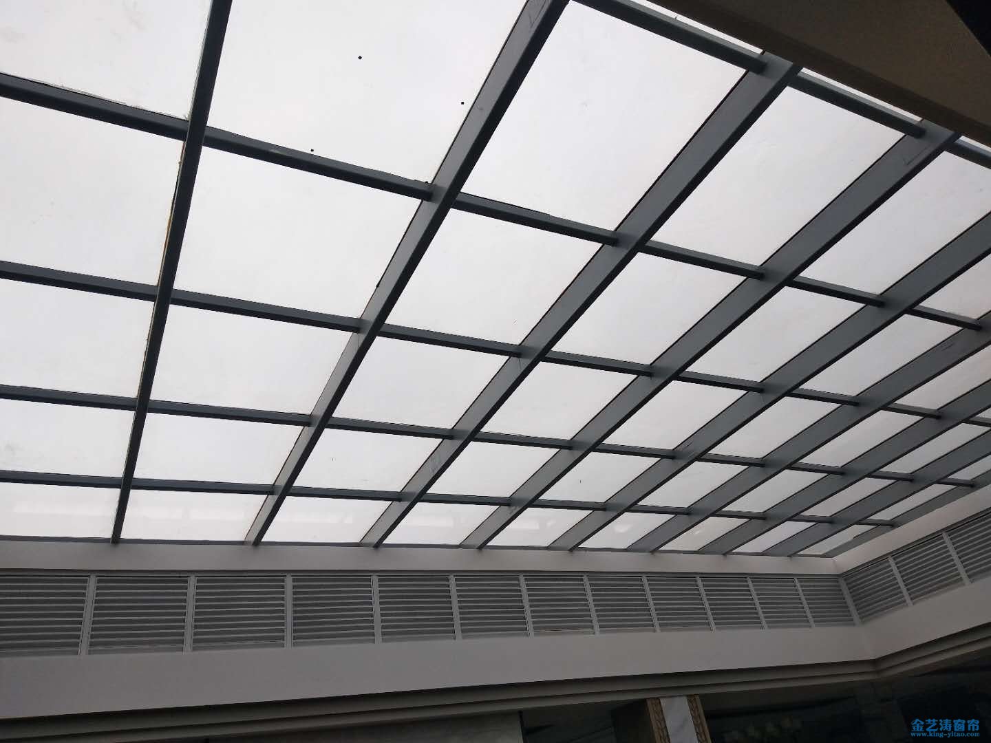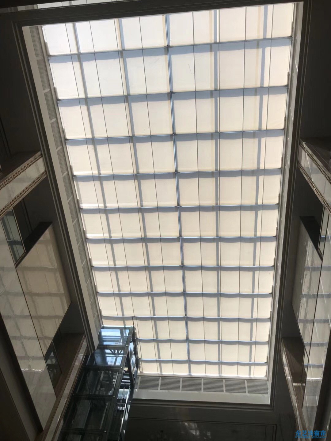 佛山電動天棚簾安裝效果_禪城南莊強輝陶瓷中空采光頂遮陽窗簾