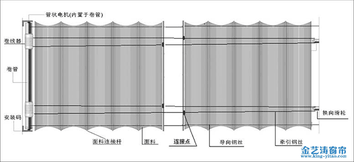 4.面料牽引桿與牽引鋼絲繩連接,在卷管(電機(jī))帶動(dòng)下面料沿著導(dǎo)向鋼絲繩往復(fù)運(yùn)行,實(shí)現(xiàn)窗簾的開合。